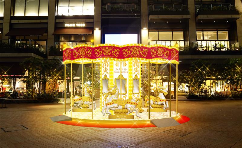 日本橋らしい縁起物、きらめく“麒麟”の乗り物が初登場!30分に1回 90秒の光と共に流れる音楽の演出をお楽しみください。